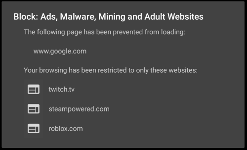5. Any attempt to access a website outside the list you specified, will result in a dialog similar to the on below. Any of the listed websites can be accessed directly by clicking the button the left of the website